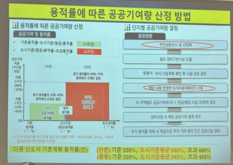 ▷다음은 용적률에 따른 공공기여량 산정 방법인데, 아직 분당의 경우에는 기준 용적률이 발표되지 않은 상태입니다. 아래 표를 보면 산본의 경우 340%, 중동의 경우 345%로 발표했다고 합니다.