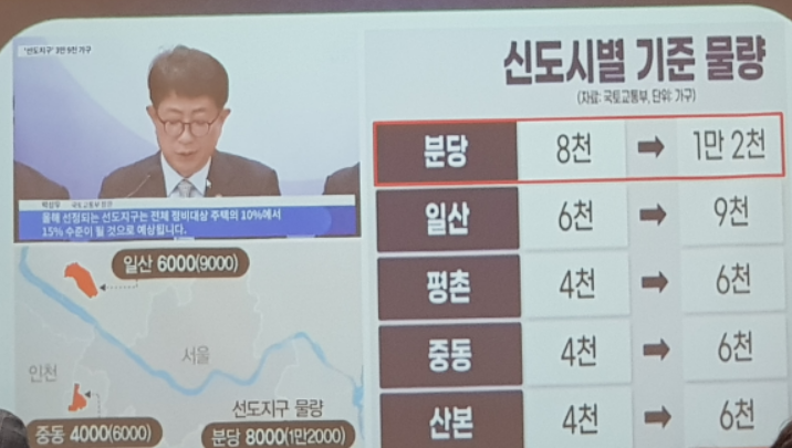 1기 신도시 특별법으로 분당 재건축을 진행하기 위해서 많은 노력을 하셨는데, 그중에 하나가 선도지구 선정 물량이 최초에는 5~10% 정도였는데, 국토부와 지속적으로 논의하여 마지막에 10~15%로 물량을 늘렸다고 하셨습니다.