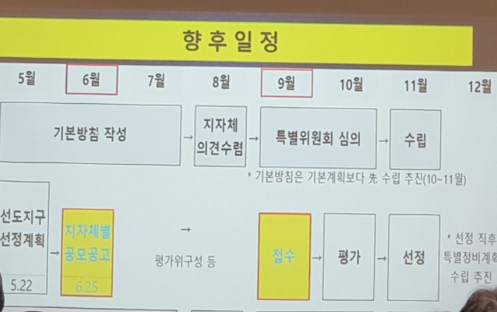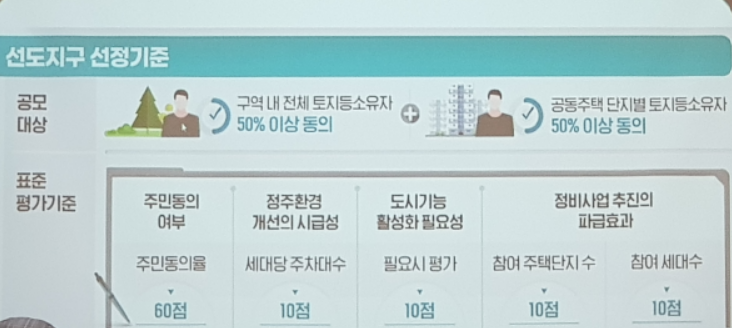 ▷5월 22일에 선도지구 선정 계획이 발표되었고, 6월 25일에는 지자체별 공모 공고가 발표될 예정입니다. 이 날부터 정식 동의율을 모집하게 됩니다. 또한 사업 실현 가능성과 같은 구체적인 점수 기준이 없는 항목에 대한 세부 기준이 발표될 예정입니다.