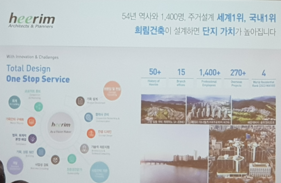 희림건축은 1970년에 설립되어 54년 역사와 직원 1,400명, 주거설계 세계 1위, 국내 1위를 하고 있습니다. 최근에는 재건축 최대어 압구정3구역 설계를 수주하였습니다.