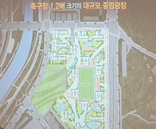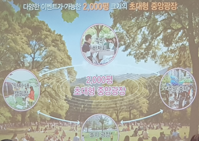 ▷중앙에 확보한 광장의 경우 축구장 1.2배 크기의 대규모 중앙 광장입니다. 이곳을 중심으로 다양한 이벤트가 가능하도록 디자인하였습니다. 단지 내 입주민을 위한 캠핑장, 주민 바자회, 주민 축제, 놀이 광장 등 2,000평에 초대형 중앙 광장에서 열리게 됩니다.