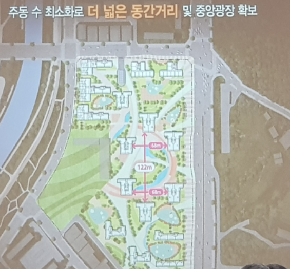 ▷주동 수를 최소화하여 더 넓은 동 간거리 및 중앙광장을 확보했습니다. 중앙 광장의 경우 최대 동간 거리가 122m, 좌우로는 66m를 확보하여 넓은 중앙 광장을 만들고 공원화했습니다.