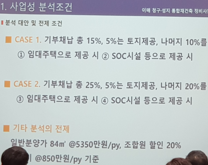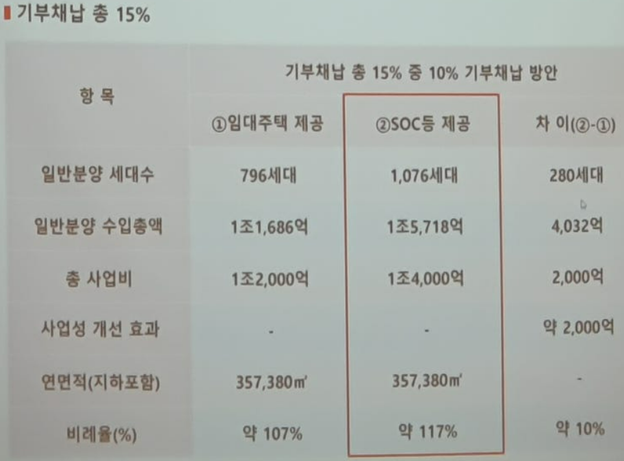 - 기부채납은 15% (10%는 SOC 시설로 제공), 34평형 일반 분양가를 평당 5,350만 원, 조합원 분양가는 일반분양가의 80%를 적용
