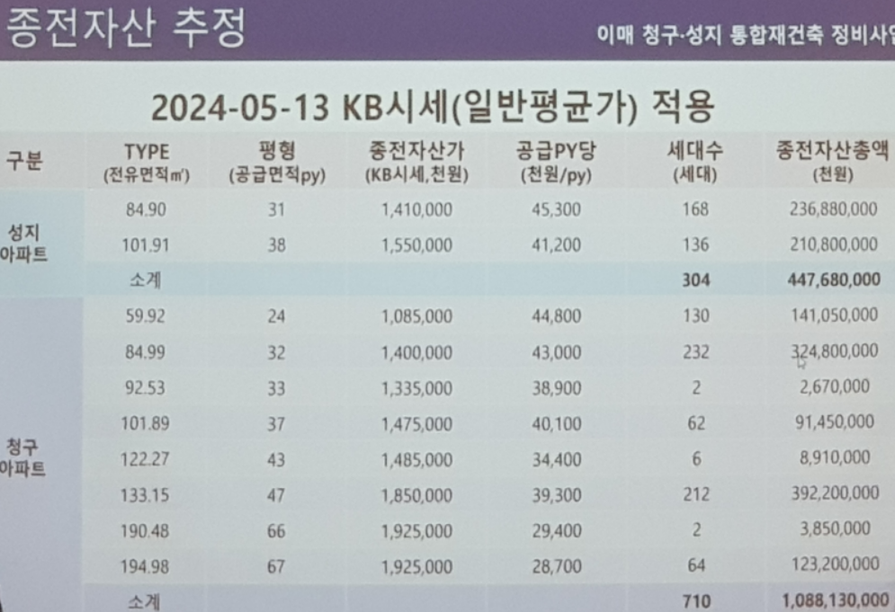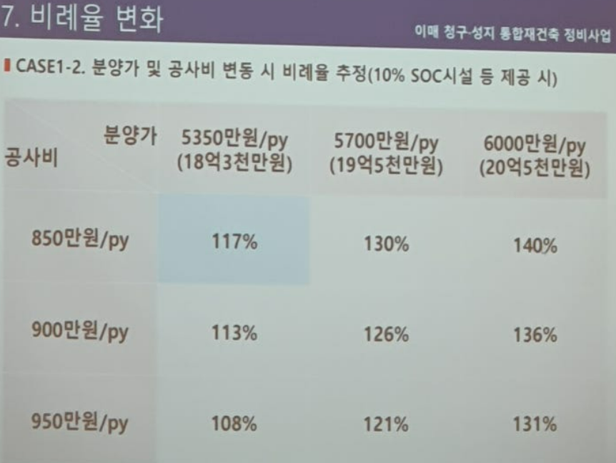 ▷이번 이매 청구·성지통합 재건축 설명회에서 가장 중요한 부분이 아닐까 싶습니다. 물론 여러 가지 가정이 들어가 있기는 하지만 그래도 실제 분담금이 어느 정도 예상되는지를 알아야 소유주를 설득할 수 있고 재건축 동의률을 높일 수가 있기 때문이죠.