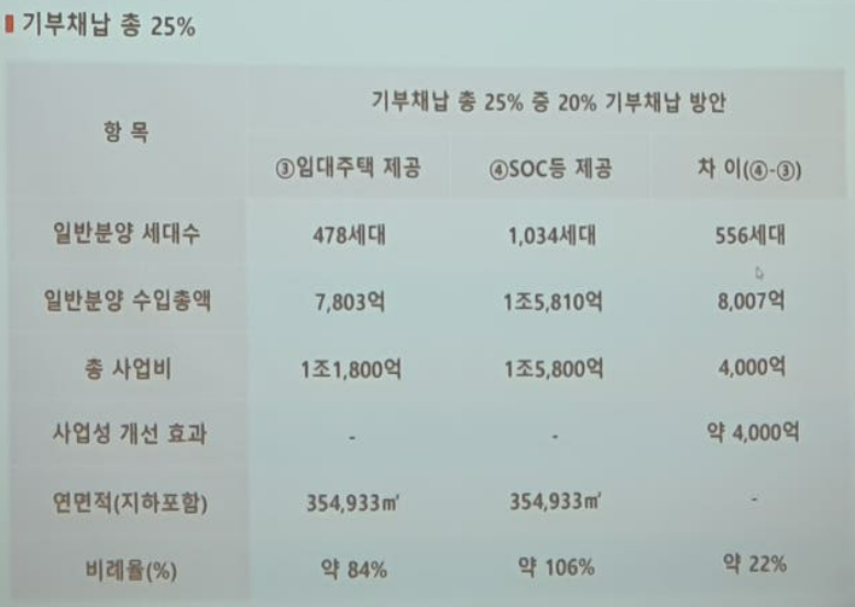 ※ 사업성을 분석해 보면 SOC 시설 등으로 제공하는 경우 가 각각 2,000억 원, 4,000억 원 사업성의 개선이 있는 것으로 나옵니다. 그 이유는 임대주택으로 제공하게 되면 공사비 대금으로 정부로부터 약 300만 원 정도 보조를 받게 되는데, 실제 공사에 필요한 금액은 850만 원으로 추가 비용이 들어간다고 합니다.