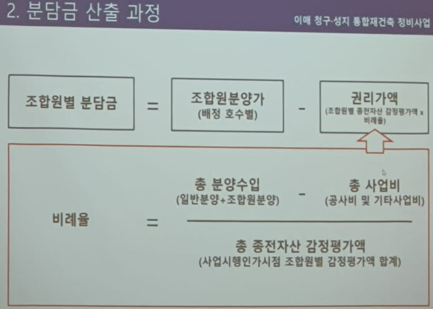 조합별 분담금 = 조합원 분양가 (배정 호수별) - 권리가액(조합원별 종전자산 감정평가액*비례율) 비례율 = {총 분양수입(일반분양 + 조합원분양) - 총 사업비(공사비 및 기타사업비)} / { 총 종전자산 감정평가액 }