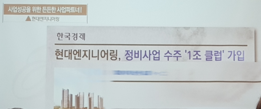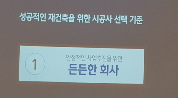 ▷마지막으로 현대엔지니어링에서는 성공적인 재건축을 진행하기 위해서는 어떤 시공사를 선정해야 하는지 기준을 제시하고 자신의 회사가 적합하다는 걸 강조했습니다. 업계 최고의 신용등급과 업계 최소의 부채 비율로 재건축 시 소유주님의 이익을 극대화할 수 있음을 제시했습니다.