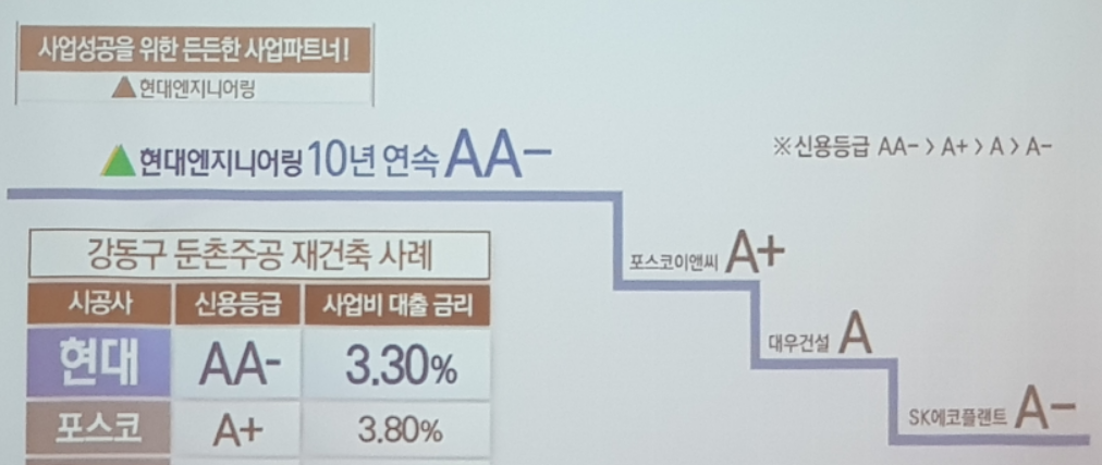 예를 들어, 둔촌주공의 경우 현대엔지니어링은 사업비 대출 금리를 3.3%를 적용 받았지만 포스코의 경우 3.8%의 대출 금리를 적용받았다고 합니다. 이는 곧 재건축 소유자의 부담이 줄어들고 전체적인 사업비를 절감할 수 있었다고 합니다.