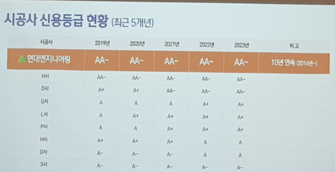 ▷현대엔지니어링은 업계에서는 드물게 10년 연속 신용등급이 AA-라고 합니다. 이 등급은 업계에서는 최고 등급으로 사업비 대출을 진행할 경우 금리가 업체 최저 수준입니다.