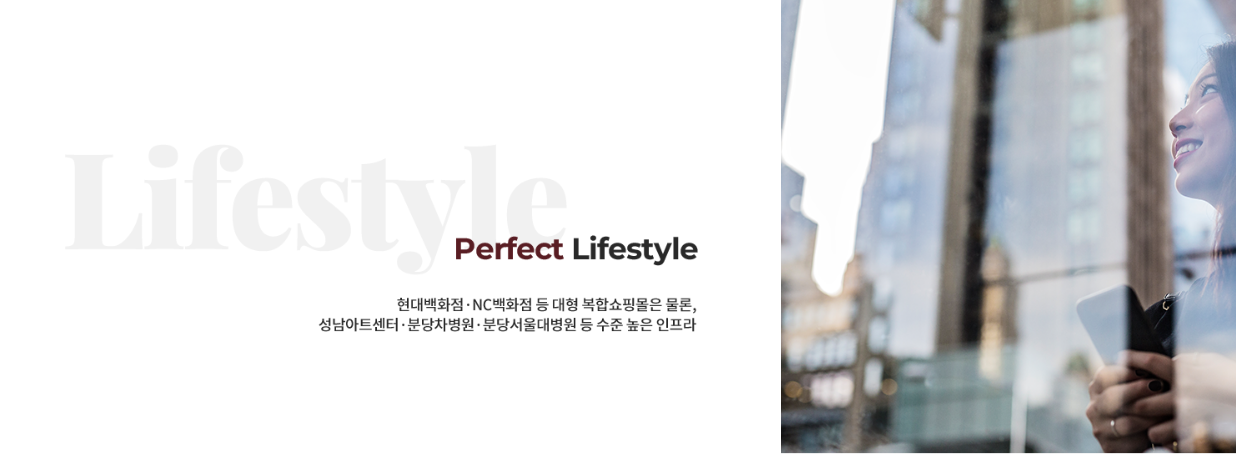 ▷다음으로는 "Perfect Lifestyle"을 내세우고 있습니다. 판교의 현대백화점, 야탑의 NC백화점 등 대형 복합 쇼핑몰을 근거리에서 이용가능하고, 성남아트센터, 분당 차병원, 분당 서울대병원 등의 인프라를 편리하게 이용할 수 있습니다. 도심에 위치한 타운하우스의 장점입니다.