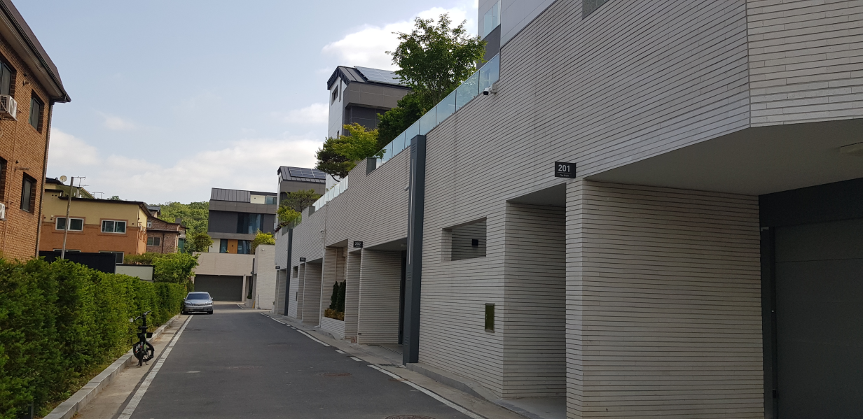 ▷201호 ~ 207호로 이어지는 도로의 모습입니다. 벙커주차장에 최대 4대까지 주차가 가능하고 바로 앞의 도로에 일부 주차가 가능하므로 최대 5대까지는 주차가 가능할 것 같습니다. 주차 부분은 분당 구축의 아파트 대비 확실한 장점입니다.