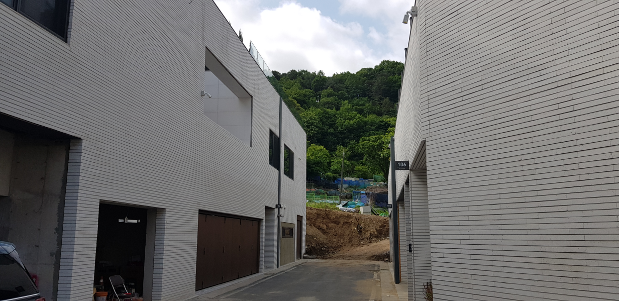 ▷104호 뒤편으로는 영장산과 연결되는 길이 보입니다. 하지만 아직 정리가 되지 않아 토사가 그대로 드러나 있는 상황이고, 주위에는 쓰레기도 많이 방치되어 있습니다. 명품 타운하우스가 되기 위해서는 주위가 많이 정리가 되어야 할 것 같습니다.