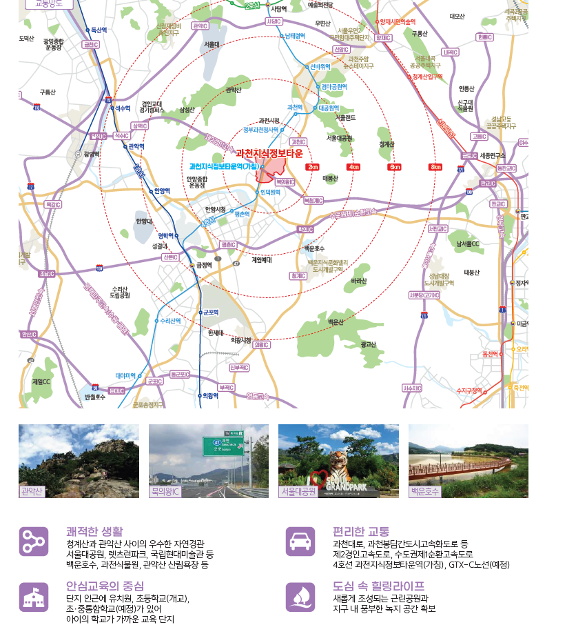 청계산과 관악산 사이의 우수한 자연경관 서울대공원, 렛츠런파크, 국립현대미술관 등 백운호수, 과천식물원, 관악산 산림욕장 등