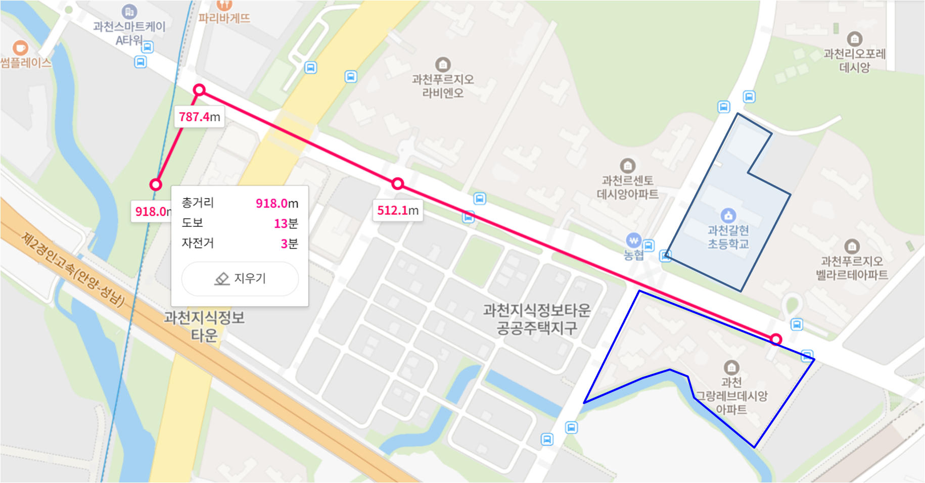 - 현재 공사중인 과천지식정보타운역까지의 거리는 대략 900미터 정도입니다. 도보로 이용 시 약 13분 정도의 거리로 도보로 이용하기에는 약간 먼 거리입니다. 2027년 개통 예정으로 현재는 정부과천청사역이나 인덕원역으로 버스로 이동 후 이용해야 합니다.