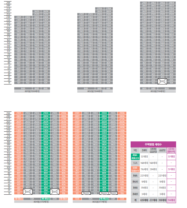 - 84A : 227세대, 84A1 : 9세대, 84B : 79세대, 84B1 : 3세대