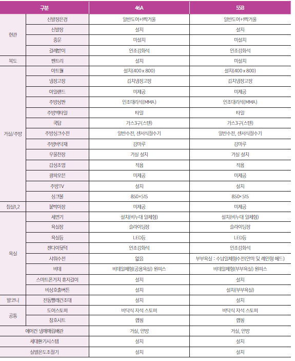 - 46A/55B의 마감재 내역을 보면 곳곳에 인조강화석이 사용되는 것을 볼 수 있습니다.