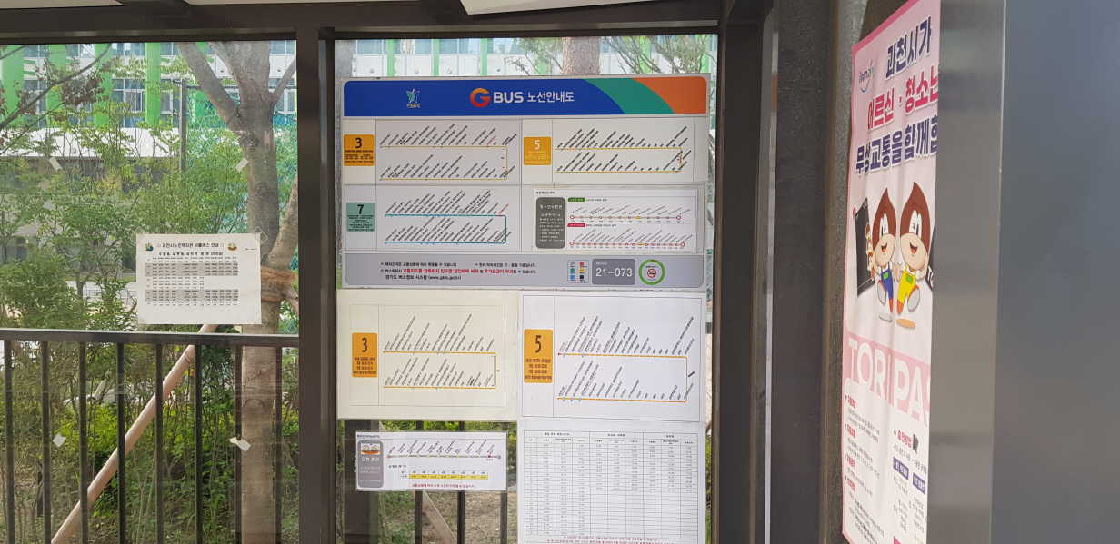 ※ 현재 제이드 자이에서 이용 가능한 버스는 3번/5번 버스가 있습니다. 하지만 배차 간격이 20~30분/40~50분으로 바로 이용하기는 힘든 편입니다. 보다 편리하게 버스를 이용하기 위해서는 과천대로에 과천린파밀리에 아파트에 버스 정류장을 이용해야 합니다.