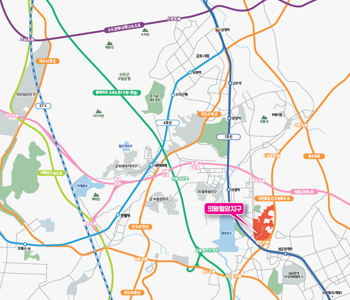 1호선 의왕역과 성균관대역 사이, 과천봉담간고속화도로 인접- 역과 고속화도로가 만드는 도시. 의왕월암이 실현합니다.