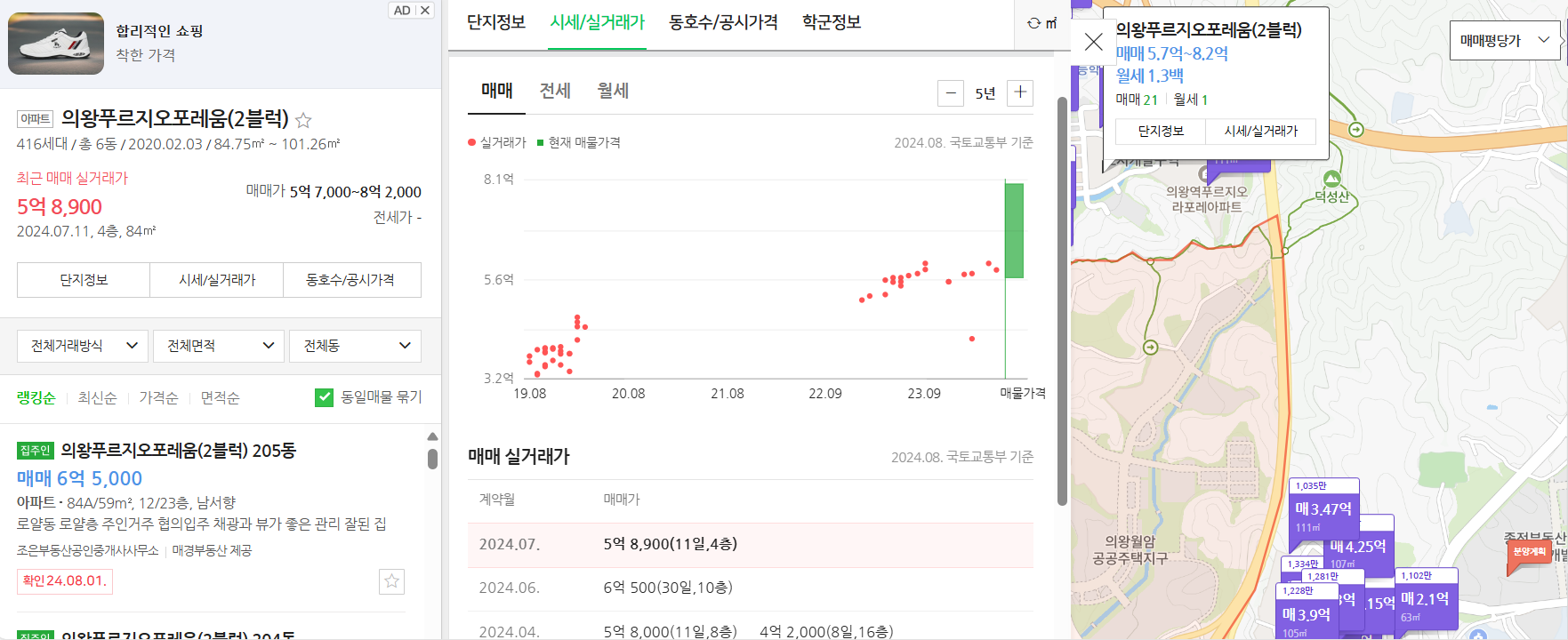 ■ 현재 의왕월암지구와 가장 인접해 있는 의왕푸르지오포레움(2블럭)의 경우 25평형이 5억 8,900백만원에 거래되었습니다. 평당가는 2,470만원 정도로 형성되어 있습니다.