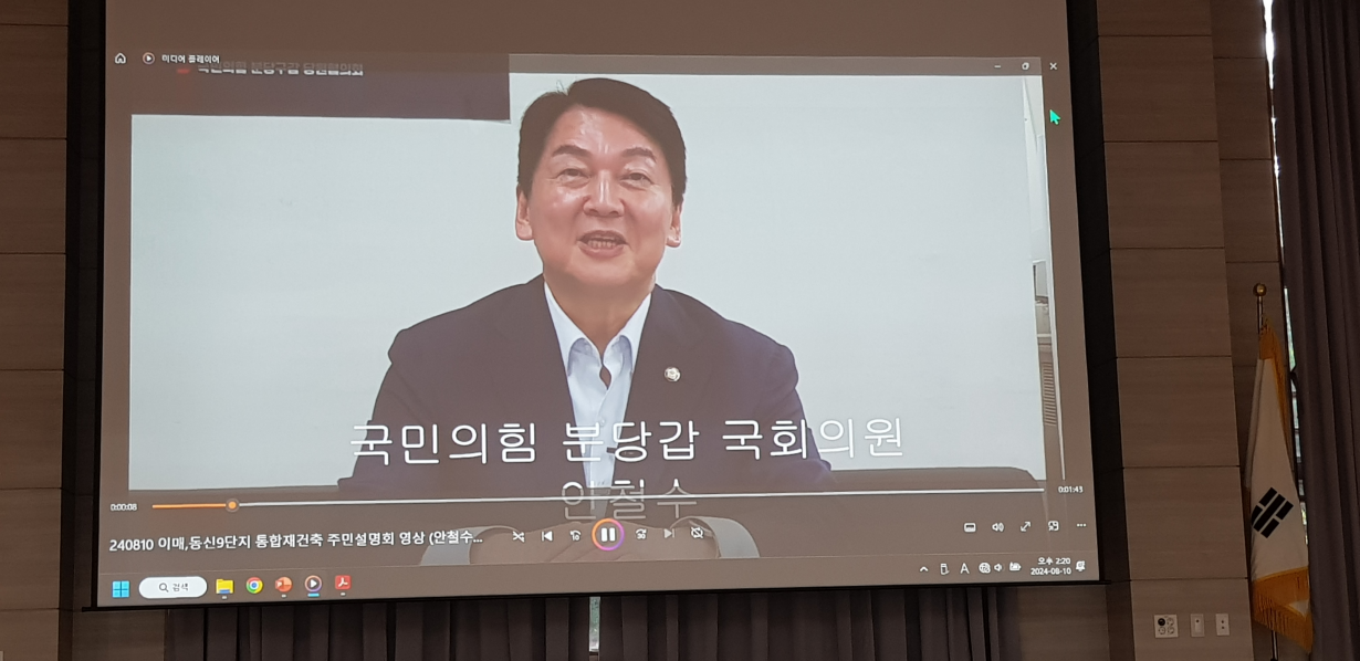 ▶오늘은 시간이 지나도 안철수의원님이 보이지 않아서 참석하지 않으시는 줄 알았습니다. 교육 관련 해외출장 관계로 직접 참석하지 못하시고 동영상으로 축사를 진행해 주셨습니다. 다른 설명회와 마찬가지로 성남시와 정부 관계자를 상대로 설득 및 설명을 진행해서 이번 선도지구를 전체 세대수 대비 10 ~ 15%까지 지정하게 되었다는 점을 강조하셨습니다.