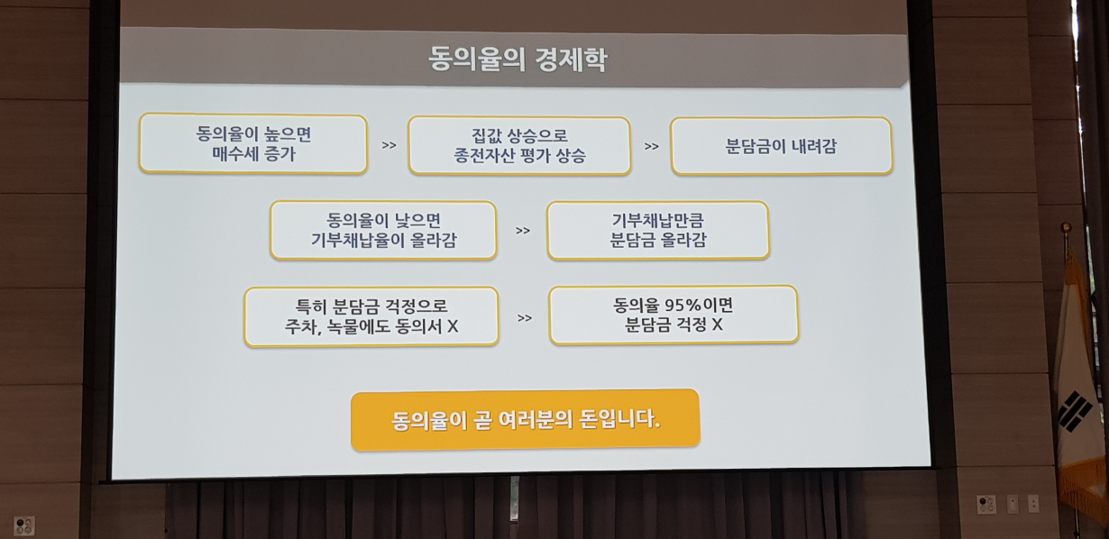 ▶그다음으로는 왜 동의율을 높여야 하는지에 대해서 설명해 주셨습니다. 이번에 분당 내에서 선도지구를 신청하는 단지의 기본적인 조건은 크게 다르지 않으므로 배점에서 크게 차이가 나지 않을 것으로 보고 있습니다. 결국 동의율이 가장 높은 단지 위주로 선도지구가 선정될 것이기 때문에 동의율 확보를 계속 강조하고 있었습니다.