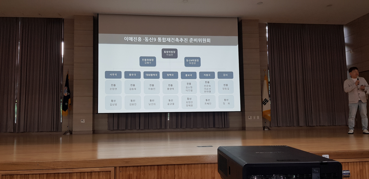 통합위원장 밑으로 진흥위원장, 동신9위원장이 각각 선임되어 있고, 분과별로 담당자가 할당되어 있었습니다. 통합 재건축을 진행한 지 얼마 되지 않았지만 전체적으로 구성이 잘되었고, 체계적으로 진행하고 있는 분위기였습니다.