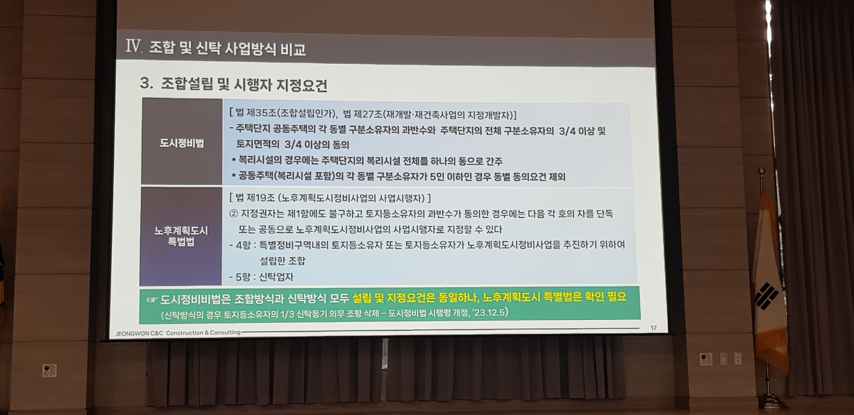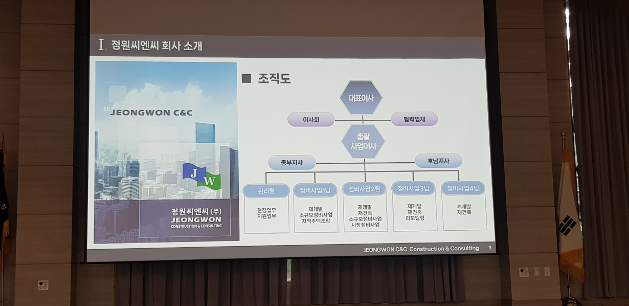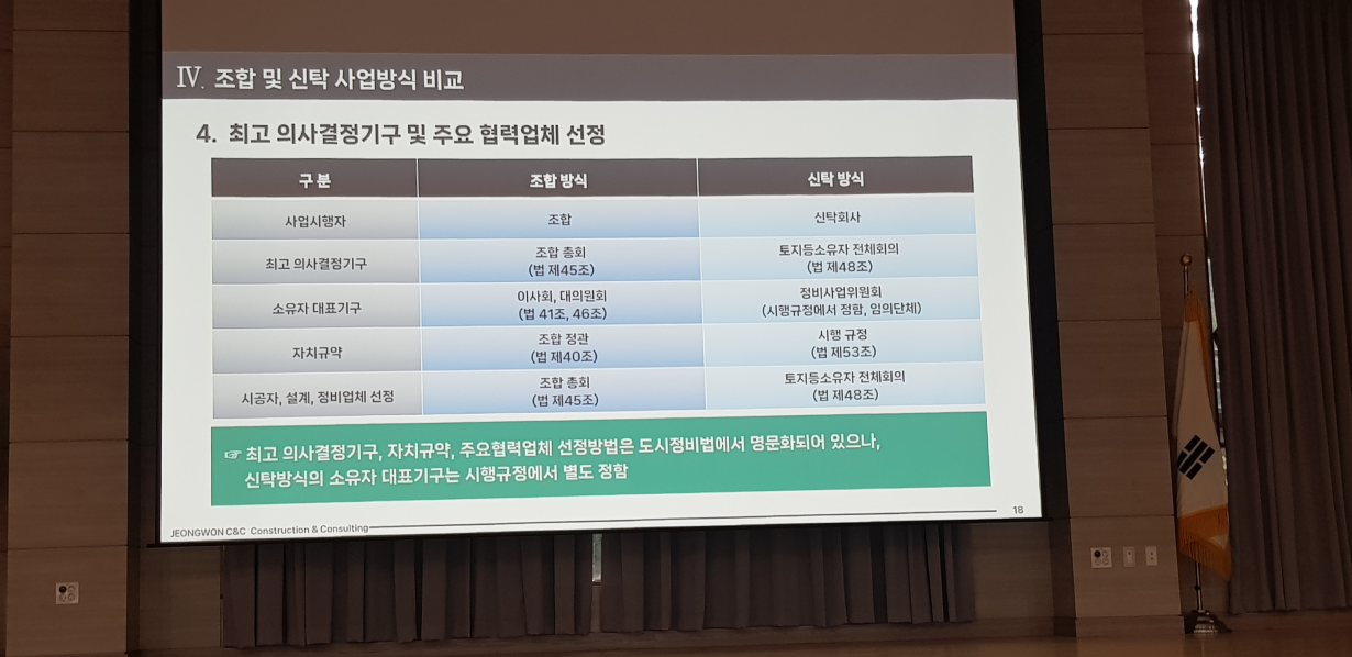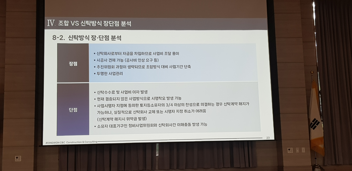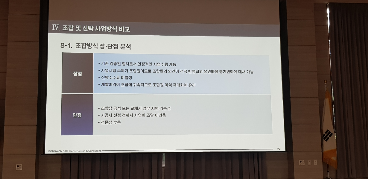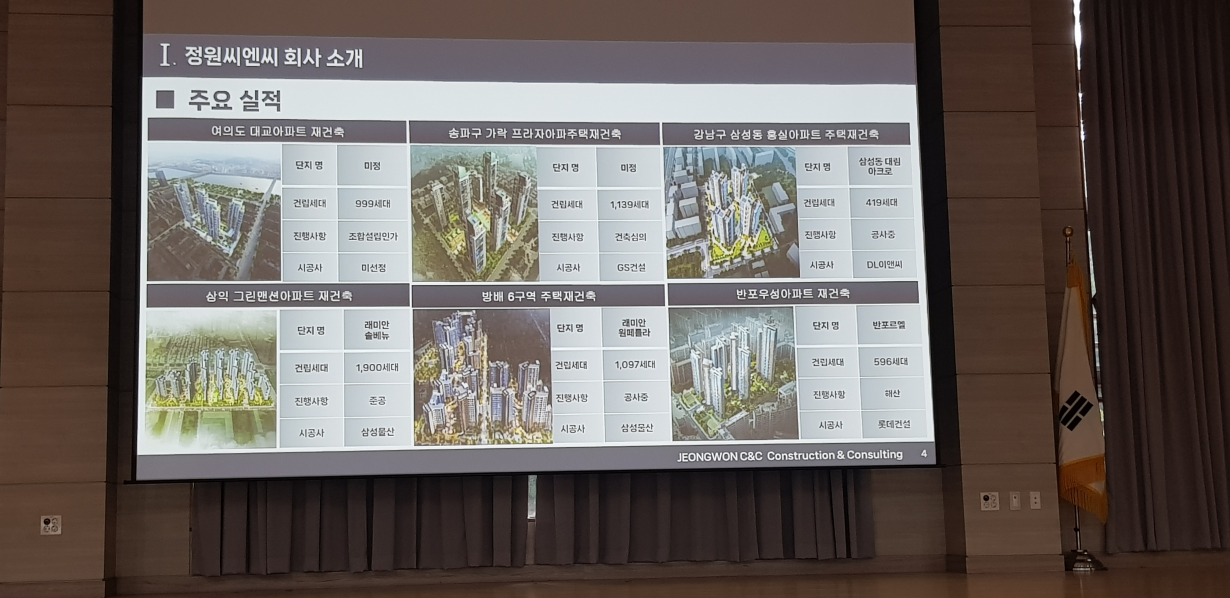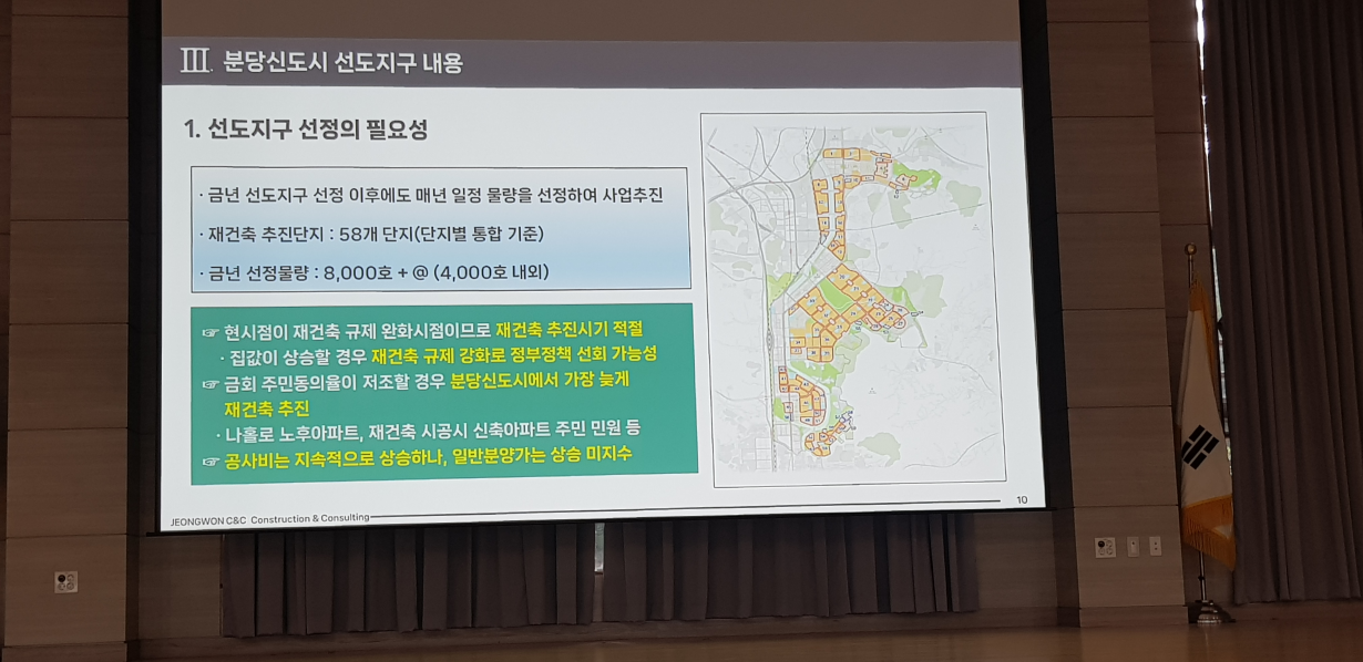 ※ 정비업체 설명은 재개발 재건축을 주로 진행하고 있는 정원씨엔씨에서 진행해 주셨습니다. 간단한 회사소개를 시작으로 분당신도시 선도지구 관련 내용과 간략하게 조합 및 신탁 사업방식 비교로 진행됐습니다.