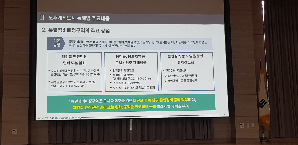 특별정비구역의 주요 장점으로는 도시 재창조를 위한 대규모 블록 단위 통합정비 등에 적용되어, 재건축 안전진단 면제 또는 완화, 용적률 인센티브 등의 특례사항 혜택이 부여된다는 점입니다.