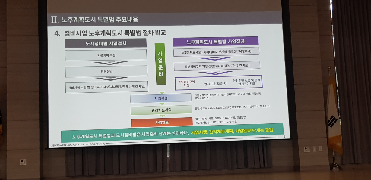 노후계획도시 특별법과 도시정비법은 사업준비 단계는 상이하나, 사업시행, 관리처분계획, 사업완료 단계는 동일하게 진행됩니다.