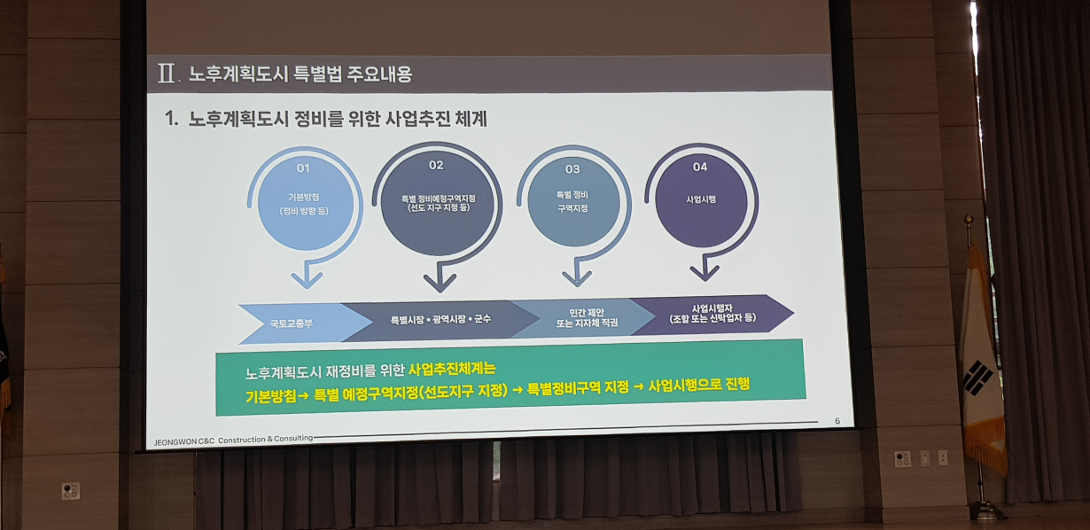 우선 노후계획도시 재정비를 위한 사업추진체계는 기본방침 -> 특별 예정구역지정(선도지구 지정) -> 특별정비구역지정 -> 사업시행 순으로 진행됩니다.